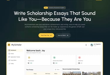 Your family's AI-powered scholarship assistant. Track applications, find scholarships matched to your student's profile, and write essays in your authentic voice—all in one place.mon